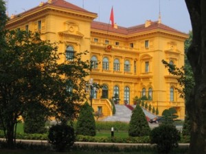 The tomb of Ho Chi Mihn must be the most austere building in the country. It’s a utilitarian concrete lump where the only splashes of colour are the red and white hats of the armed guards. We walk over to a spartan wooden stilt house on a lake, where the founding father of the socialist republic apparently lived and worked. “He was a simple man,” our guide says. Which leaves me perplexed by the beautifully ornate yellow presidential palace. You mean Ho Chi Mihn preferred to stay in a cold, damp and probably mosquito-infested stilt house, rather than occupy the luxurious palace round the corner? Ok, if you say so….