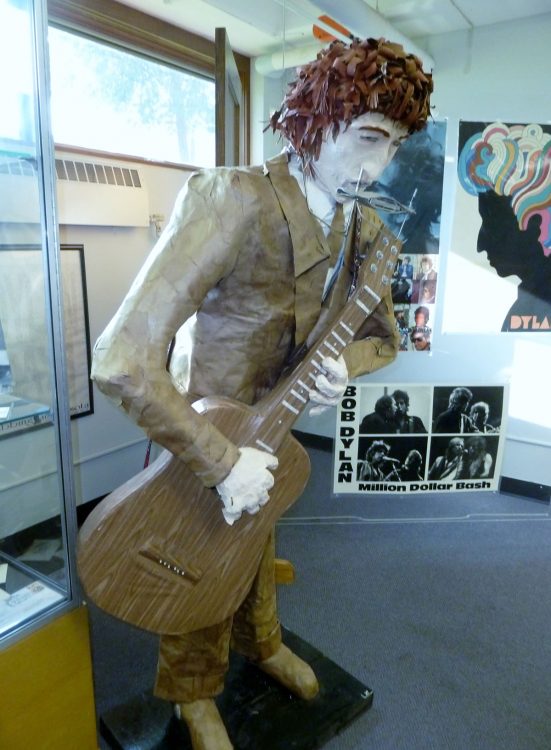 But in 2005, says Keyes, about 99 percent of the residents of 7th Avenue East signed a petition to rename the street for the homegrown American icon. A little over a decade earlier, he was first immortalized here when a Bob Dylan exhibit opened in the city public library. There are Dylan albums, photos of Dylan and friends through the years, concert posters, a captivating photo of blonde Echo Helstrom, and a papier-mache likeness of Dylan engaged in playing guitar and harmonica. There are also physical pieces of the Zimmerman home: bathroom tiles, door hardware, and a window. At one point the owner of Dylan’s boyhood home had a full-sized copy of the cover of Dylan’s album, “Blood on the Tracks” painted on the garage door. The door was lost to years of exposure but a photograph of it occupies a space on a wall here.