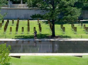 Okla 2 two people walk between reflefting pool and memorial chairs (OSM)